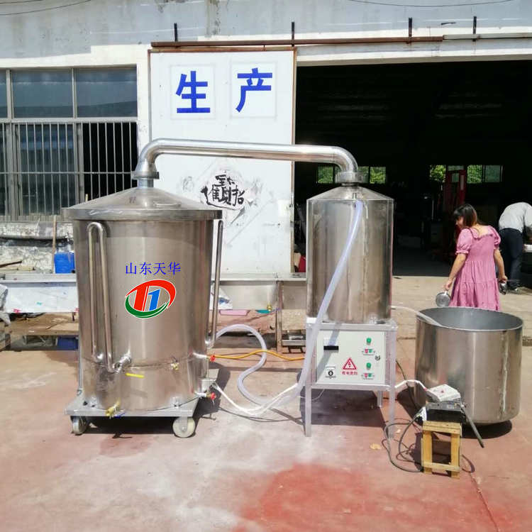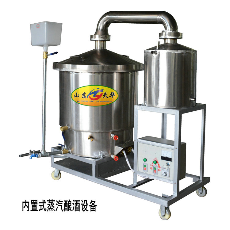 天華新型蒸汽式釀酒設(shè)備整機裝在可四輪拉車上,移動、使用方便,安全可靠,以電加熱或煤氣加熱蒸酒,操作簡單,衛(wèi)生環(huán)保,便于流動或上門蒸酒,是家庭,集貿(mào)市場、小型酒坊進行糧食酒蒸餾的理想設(shè)備,它的出現(xiàn),使人們告別了勾兌酒,可以飲用健康放心的白酒,同時也提高了糧食轉(zhuǎn)化收益。